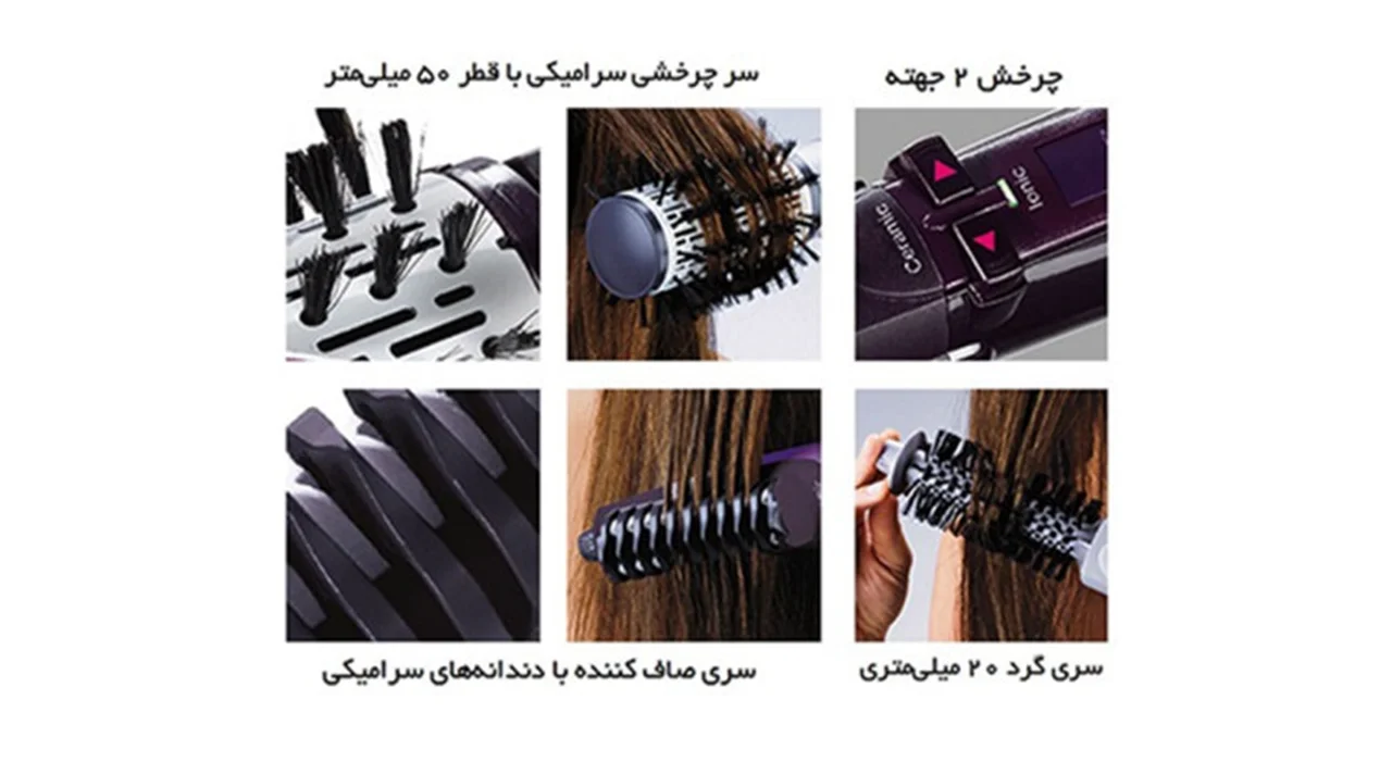 سشوار چرخشی «2736SDE» تولید شرکت «بابیلیس» (Babyliss)، دارای سریهای مختلف است که هرکدام کاربردهای متفاوتی دارند. برس گرد 50 میلیمتری و 20 میلیمتری برای حجمدادن و حالتدارکردن موها استفاده میشوند. برای صاف و خشککردن موها میتوان سریهای دندانهدار و متمرکزکننده را به کار برد. برس 50میلیمتری گرد و سری دندانهدار از جنس سرامیک ساخته شدهاند که در برابر حرارت مقاومت زیادی دارد. ویژگی دیگر سرامیک پخش یکسان دما در تمام قسمتهاست. 2736SDE وزن زیادی ندارد؛ بنابراین دردستگرفتن آن هنگام حالتدادن موها بسیار آسانتر میشود. فناوری پیشرفتهی استفادهشده در این محصول، تولید یون است. این فناوری به حفظ چربی داخل تارهای مو کمک کرده و از آسیبدیدگی موها جلوگیری میکند؛ همچنین با تولید میلیونها یون منفی و شکستهشدن سریعتر مولکولهای آب، موها با سرعت بیشتری خشک میشوند؛ ضمن اینکه جذب این یونها به نرمی و لطافت تارهای مو میافزاید. محل اتصال سیم بهصورت چرخشی است که این ویژگی بهراحتتر حرکتدادن سشوار کمک میکند. با استفاده از تنظیمات مختلف دما و سرعت میتوان موهای خشک و مرطوب را راحتتر صاف کرد یا حالت داد و به کمک باد سرد میتوان حالت موها را تثبیت کرد.